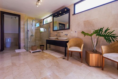 Each of the five bedrooms have private en-suite baths, and the two master suites have adjoined living spaces and terraces for lounging. The main master suite features a secluded outdoor shower, nestled within a tropical garden. One of the master suites is located on ground floor level and features an apartment-like set-up with a kitchen and living area, perfect for hosting guests and family visitors.