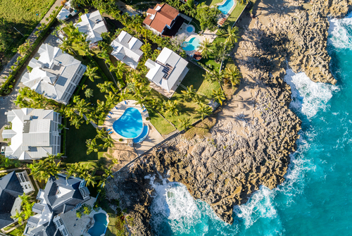 Gorgeous oceanfront Victorian style villa sits in a small gated community with similar designed other properties in a classic style. Facing the water without obstruction it has breathtaking panoramic views across the north Atlantic ocean. Cool breezes make this an ideal place for a vacation villa or year round living. Large backyard with green grass, 24/7 security and electricity in a peaceful setting where you can walk from the center of town.